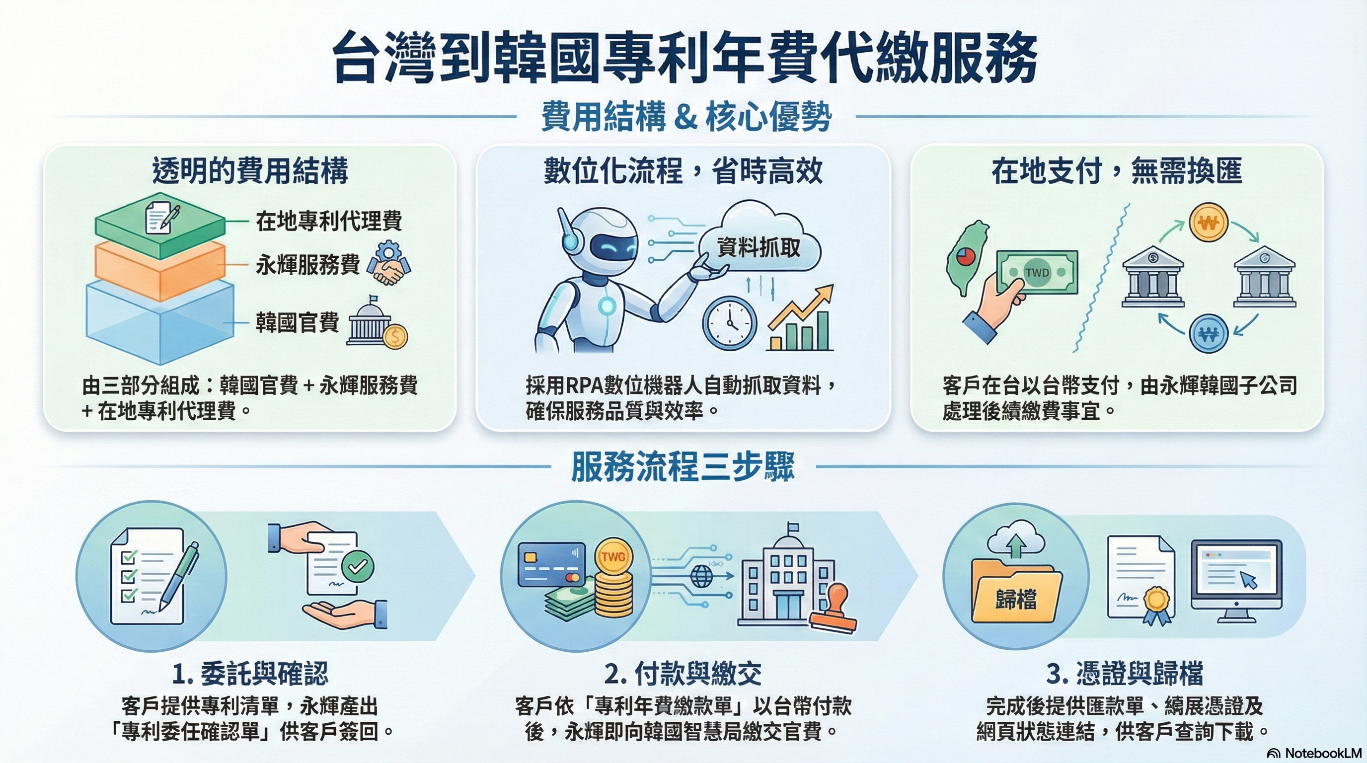 永輝團隊會用RPA數位機器人去韓國的智慧財產局取得專利相關資料,並產生”專利委任確認單”列出韓國韓圜的官費,加上永輝服務費,和在地專利師代理費。產生”專利委任確認單”後交給貴司確認。